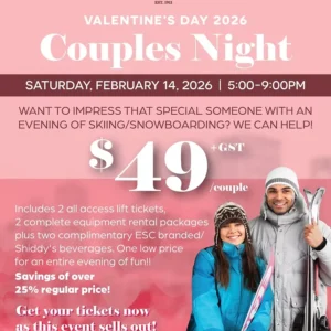 $49+GST/couple special valentines offer. include 2 all access lift tickets, 2 complete equipment rental packages and 2 beverages. Purchase your event tickets in advance. ...